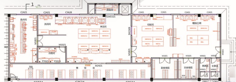 根據(jù)工作實(shí)際需要選用設(shè)備,按照工藝流程順序布局設(shè)備,確保工作流程順暢。設(shè)計(jì)中需要考慮人員運(yùn)動、操作動作、物流順序,按照工作流程流水線運(yùn)作,減少無效勞動,使物流生熟分開、潔污分離。例如,粗加工間一進(jìn)門就應(yīng)設(shè)有菜架、冰柜,原料進(jìn)入工作間,要有存放位置;其次就要有撿摘、清洗的工作臺、洗菜池、垃圾車,以及凈菜存放位的貨架、運(yùn)送的車輛。