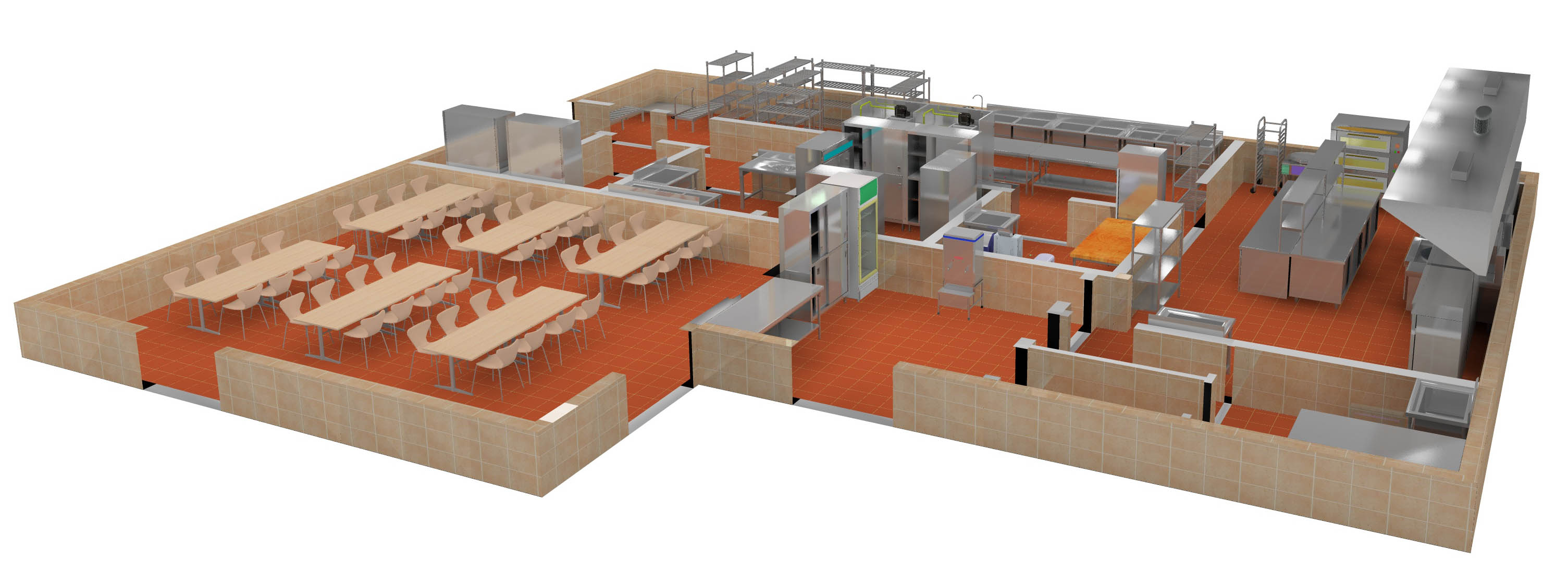 主要炒菜區(qū)為L形布局,根據(jù)需要設(shè)置打荷臺與切配工作臺、保證主要炒菜灶的工作需要。