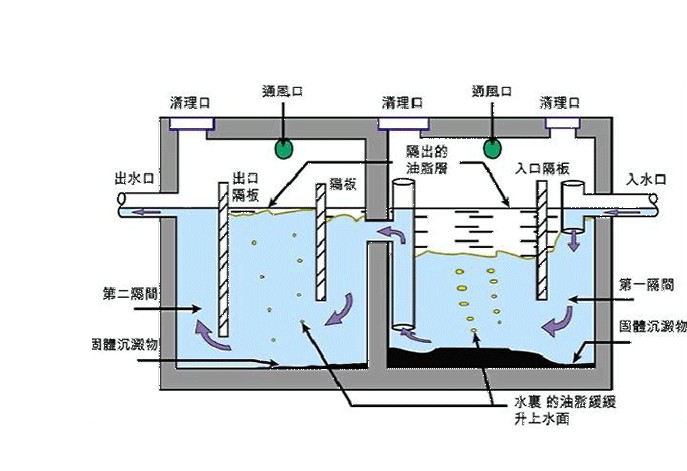 廚房隔油池也稱為油水分離池,利用各種廢棄物的密度、體積大小的不同特點(diǎn)加以分離。流程機(jī)理為:含有污油等廢棄物的污水從排水管流入濾篩筐,先除去較大的菜葉、食物殘?jiān)裙虘B(tài)廢棄物,泥沙、碎末等細(xì)小廢棄物在沉降室進(jìn)行沉淀,固液分離;污油浮于水面,隔油板阻擋浮油,經(jīng)初級(jí)、次級(jí)、三級(jí)分離室進(jìn)行大廢棄物、小廢棄物、油、水分離,清除易腐爛的有機(jī)固體和液體廢棄物,使污水凈化排放。浮油在隔離室的上部,大廢棄物在濾篩筐中,沉淀物在池底,需要人工定期清理。